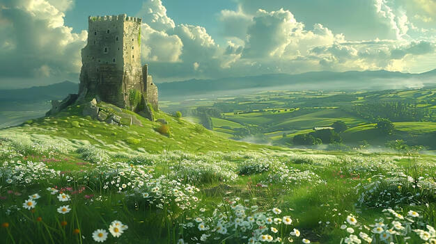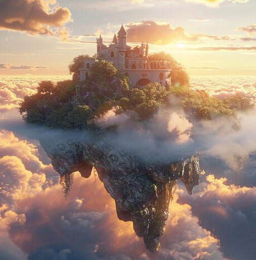 CloudbreakCloudbreak is a majestic floating fortress, drifting above the world in a sea of rolling clouds. Its jagged rock base, adorned with vines and greenery, supports an ancient castle whose spires pierce the heavens. Blending celestial and mortal craftsmanship, the stronghold radiates both beauty and power.─┉.·:¨༺ ༻¨:·.┈┉